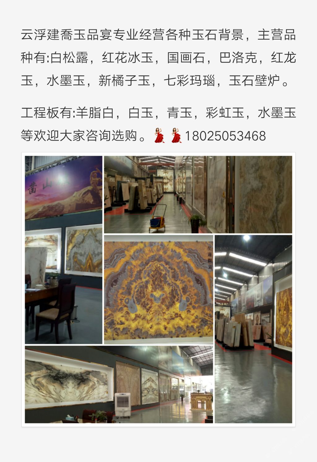 本公司有現(xiàn)貨各類精品高檔玉石背景墻。圖案精美,品種多樣,各種大小尺寸拼圖,板材足足1.8厚。歡迎來電咨詢!