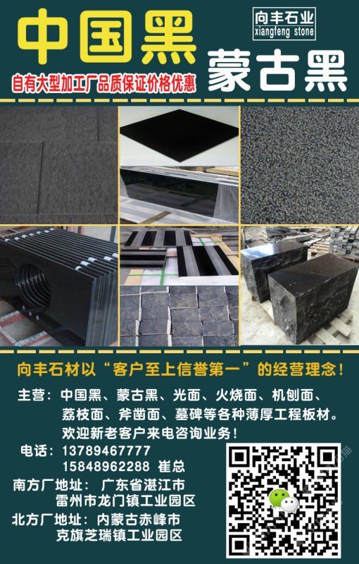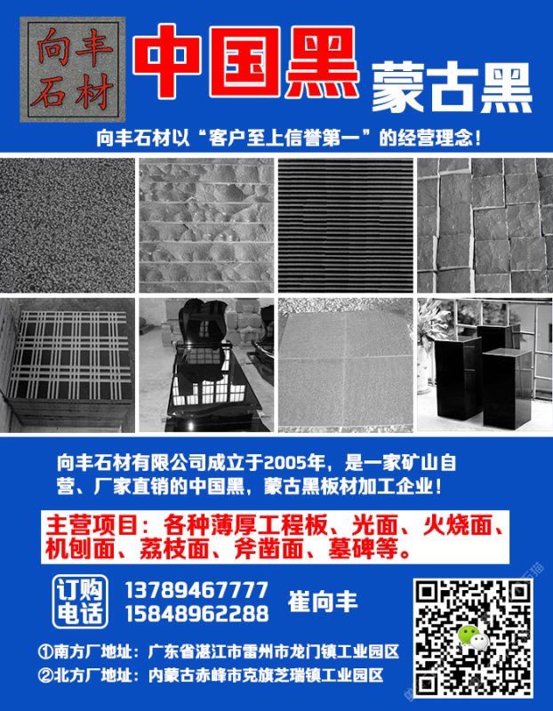 向豐石材有限公司成立于2005年,是一家礦山自營(yíng)的蒙古黑板材加工企業(yè)!主營(yíng)項(xiàng)目:各種薄厚工程板、光面、火燒面、機(jī)刨面、荔枝面、斧鑿面、墓碑等。向豐石材以“客戶至上信譽(yù)”的經(jīng)營(yíng)理念,先進(jìn)的技術(shù)和現(xiàn)代化管理為基石,不斷的開拓創(chuàng)新與時(shí)俱進(jìn)?,F(xiàn)已經(jīng)發(fā)展為南北方跨區(qū)域生產(chǎn)企業(yè),至今完成多個(gè)大型項(xiàng)目并多次中標(biāo)。高效的生產(chǎn),優(yōu)質(zhì)的產(chǎn)品得到業(yè)主單位的好評(píng),樹立了良好的企業(yè)形象。我們堅(jiān)信,以“質(zhì)量求生存,誠(chéng)信為根本”一定會(huì)贏得更好的明天!