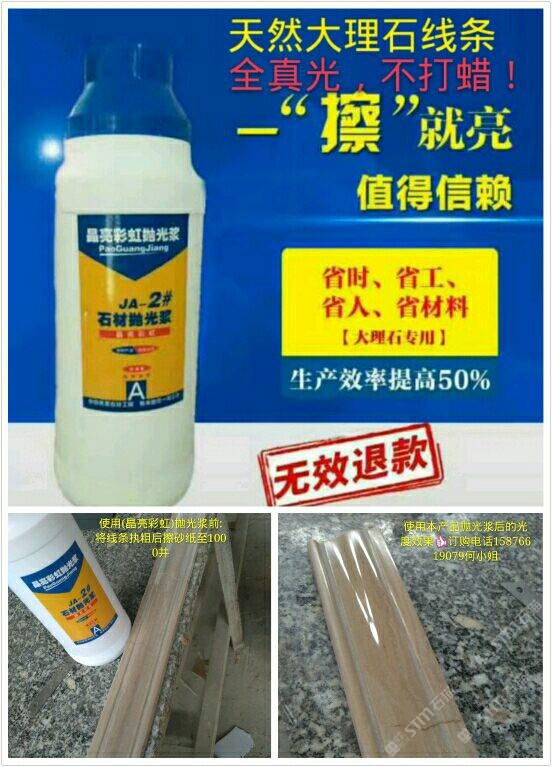 (晶亮彩虹拋光漿)為配方調(diào)制。從2016年5月份開始靠著技術(shù)員親自逐間上門到云浮多家石材工藝廠施展產(chǎn)品使用技術(shù)和試驗產(chǎn)品光度效果取得了各家老板和工藝師們的稱贊和認(rèn)可,通過短短一年的時間品牌:晶亮彩虹拋光漿全國省地已約2000家石材廠正在使用,市場反應(yīng)效果顯注,現(xiàn)面向全國誠招代理商??头峋€:15876619079