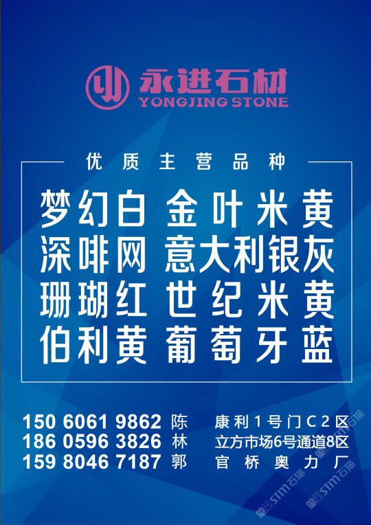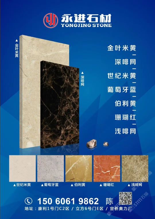 永進(jìn)石材主營:魚肚灰,夢(mèng)幻白,土耳其愛馬仕灰,意大利銀灰,金葉米黃、深啡網(wǎng)、世紀(jì)米黃、珊瑚紅、伯利黃、葡萄牙藍(lán);