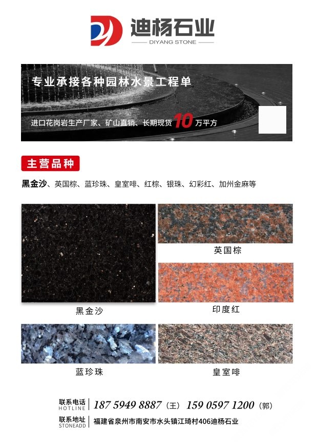 迪楊石業(yè)是一家專營(yíng)進(jìn)口花崗巖,集石材加工銷售工程及出口貿(mào)易為一體的,主營(yíng)黑金沙,印度紅,皇室啡,英國(guó)棕,綠星,銀珠,金鉆麻等各種進(jìn)口花崗巖,可承接外墻干掛,園林水景,地鋪家裝等各種異形加工,各種尺寸規(guī)格的大小工程單。歡迎來(lái)電咨詢