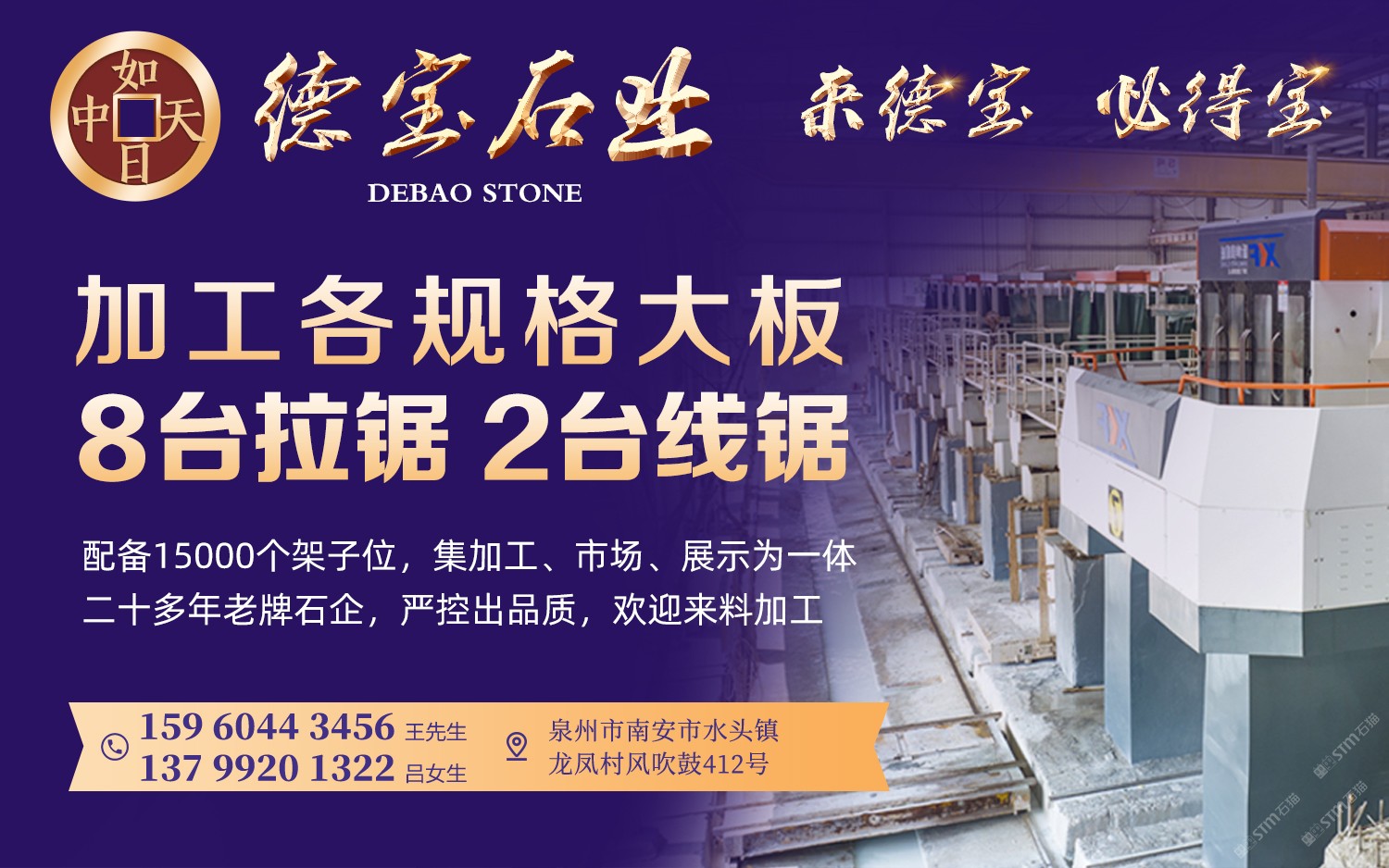 德寶大理石專業(yè)加工各規(guī)格大板,8臺(tái)拉鋸2臺(tái)線鋸,配備15000個(gè)架子位,是一家集加工、市場(chǎng)、展示為一體的二十多年老牌石企,嚴(yán)控出品質(zhì),歡迎來料加工! 加工優(yōu)勢(shì): 1、廣闊空間,精良配置:坐擁遼闊場(chǎng)地,配備一應(yīng)俱全的高端設(shè)備,以宏大的規(guī)模鑄就非凡品質(zhì),每處細(xì)節(jié)都彰顯著對(duì)的不懈追求 2、匠心管理,經(jīng)驗(yàn)護(hù)航:管理層匯聚十?dāng)?shù)載風(fēng)雨同舟的老將,他們以深厚的行業(yè)積淀,對(duì)產(chǎn)品的每一個(gè)細(xì)微之處都施以匠心獨(dú)運(yùn)的把控 3、貼心服務(wù),省時(shí)無憂:特設(shè)跟單專員,代勞客戶繁瑣跟單事務(wù),讓您在繁忙中也能享受輕松與高效,省時(shí)省心,效率與滿意并驅(qū)前行 4、精選輔料,光澤:我們堅(jiān)持使用遠(yuǎn)超市場(chǎng)標(biāo)準(zhǔn)的專業(yè)級(jí)輔料,不僅穩(wěn)固了產(chǎn)品的堅(jiān)實(shí)基礎(chǔ),更提升了板面光澤度,賦予非凡質(zhì)感 5、嚴(yán)苛質(zhì)檢,品質(zhì)保證:內(nèi)部質(zhì)量監(jiān)控體系嚴(yán)苛,出品均需達(dá)標(biāo)方能榮耀出庫(kù)。我們堅(jiān)持品質(zhì)至上,每個(gè)產(chǎn)品都是對(duì)品質(zhì)的承諾與堅(jiān)守