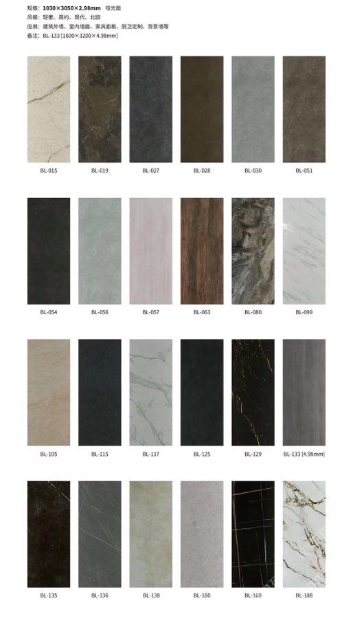 發(fā)布信息: ????SIBELAN 斯貝納巖板???? ????意大利設計師精選巖板???? 我們可以幫老總您加工為成品, 全國范圍內可安排專業(yè)團隊安裝. 做到您一次性采購 省心. 放心. 省時. 低價! 巖板紋路版面全多達199 款 勵志做服務五星的巖板專業(yè)供應商 魚肚白 雪花白 格蘭云天 寒江雪 爵士白 幻影灰 勞倫黑金 火山灰 亞馬遜 艾維拉 羅馬黑檀 貝特巖 細花白 羅馬灰 云朵拉灰 魚肚金 莎羅娜 莎羅蘭 勞倫白金 拉薩白 中花白 灰冰玉 卡拉拉白 撒金黑 清水玉 薩瓦灰 莎士比亞 大花灰 白冰玉 銀灰洞 阿瑪尼灰 綠紋玉 綠冰玉 藍紋玉 保加利亞灰 鐵銹 黑木紋 流砂灰 純白 純灰 純黑 TEL: 15905069590 聶 各種版面規(guī)格全部如下: 1200×600×11mm 啞光 1500×800×11mm 啞光 1800×900×11mm 啞光 1800×900×12mm 啞光 2600×800×15mm 啞光 2400×1200×6mm 啞光/亮光 2400×1200×9mm 啞光/亮光 2400×1200×15mm 啞光 2700×1200×6mm 啞光/亮光 2700×1600×12mm 啞光/亮光 3200×1600×6mm 啞光/亮光 3200×1600×12mm 啞光/亮光