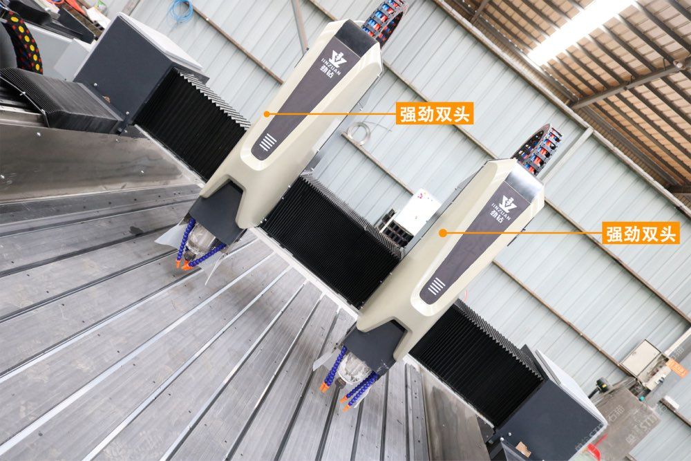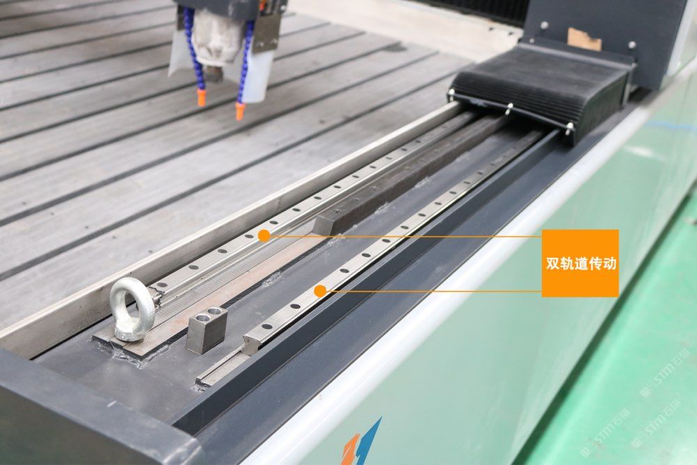 在機(jī)身配件上面,傳統(tǒng)3軸雕刻機(jī)采用的是單導(dǎo)軌,2020年我們推出了xy軸雙導(dǎo)軌,z軸四導(dǎo)軌,結(jié)合7.5kw恒功率主軸電機(jī),承重力大,運(yùn)行更平穩(wěn),切削力度大,效率更高。傳動(dòng)方面告別傳統(tǒng)的履帶,采用全伺服電機(jī)加減速機(jī)。Z軸帶剎車(chē),速度更快,動(dòng)力更足,精度更高,也更平穩(wěn)。