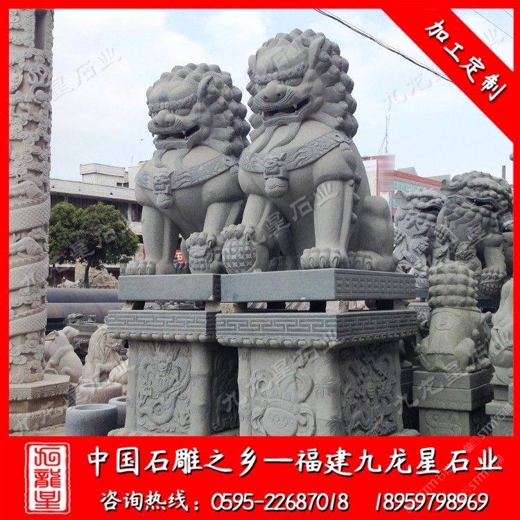 發(fā)布信息: 九龍星石業(yè)是石雕獅子廠家,從事石雕獅子加工制作20多年,石雕獅子款式多樣,價(jià)格合理。石雕獅子材質(zhì)可以為花崗巖、大理石、漢白玉、青石等等,望廣大新老客戶前來(lái)參觀考察和選購(gòu)。 石雕獅子顧名思義就是有石材雕刻而成的石雕獅子,石刻石獅子寓意很多,深受人們喜歡,民間流傳石雕獅子的寓意都很吉祥。 傳統(tǒng)石雕獅子作為中國(guó)傳統(tǒng)建筑中經(jīng)常使用的一種裝飾物,人們喜愛(ài)將它擺放在家門口,有的獨(dú)立的獅子把門,有的放在門枕石上,有的與石鼓結(jié)合在一起。石雕獅千姿百態(tài),造型靈活。自唐代以來(lái)的大型石雕獅子基本上保持統(tǒng)一的坐姿,與漢代獅子石像常有的匍匐姿態(tài)相比,更接近于休憩而非狩獵,反映出唐代時(shí)期生活的富足、社會(huì)的安定,以及整個(gè)社會(huì)尤其是統(tǒng)治階級(jí)追求安逸、享樂(lè)的心態(tài)。大型石雕獅子有3米石獅子、2.8米石獅子也有2米石獅子。