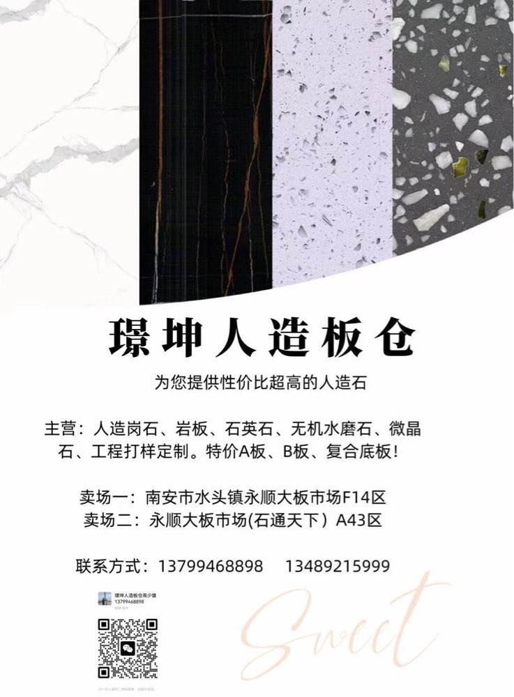 發(fā)布信息: 一璟坤人造板倉一 主營:人造崗石,石英石,巖板,無機水磨石, 微晶石,工程打樣定制,特價A板,B板,復合底板 賣場地址:福建省南安市水頭鎮(zhèn)永順大板市場A43區(qū),F10一F14區(qū)。財富熱線:13799468898高先生