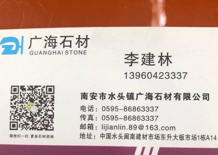 廣海石業(yè) 聯(lián)系人:李建林    139****3337 查看 手機號碼:無 主營范圍: 大板批發(fā)、石材外貿(mào)、玉石加工、 企業(yè)地址:福建泉州水頭鎮(zhèn)東升大板市場1通道A14區(qū)