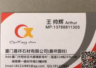 廈門晨祥石材有限公司主營產(chǎn)品:英國白麻,云朵拉灰(onur礦),實心圓柱(大理石),欄桿花瓶柱(大理石),動物雕刻(園林)企業(yè)地址:福建泉州南安市水頭鎮(zhèn)建材市場23棟6-8號